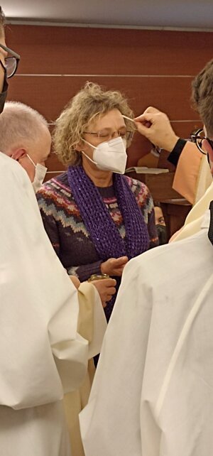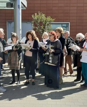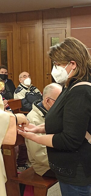 Sr. Maria Grazia Viganò, oncologa del S. Raffaele, ci detta l'intenzione alla decina animata dai nostri ammalati e dal personale sanitario del nostro ospedale.